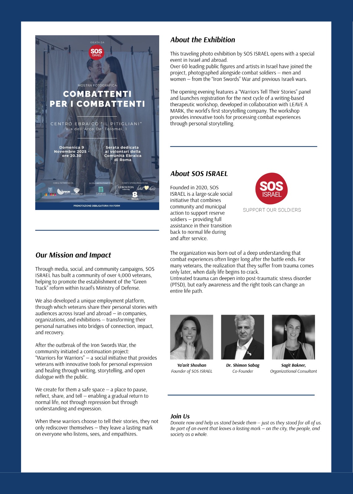 עוד במהלך האירוע אמרה מייסדת ונשיאת ארגון "SOS Israel" שהיא גם מנהלת פרוייקט יחודי זה, יערית שושן: "בעידן שבו האנטישמיות שוב מרימה ראש ברחבי אירופה והעולם, האחריות שלנו ושל כולנו היא להיאבק בה לא רק בדיבורים, אלא גם באמנות, בתיעוד ובחשיפה של סיפורי הגבורה האמיצים של גיבורינו חיילי צה”ל. דרך הצגת הפנים היפות של עם ישראל והאומץ של לוחמיו, אנחנו שולחים מסר של אור ותקווה לעולם כולו."