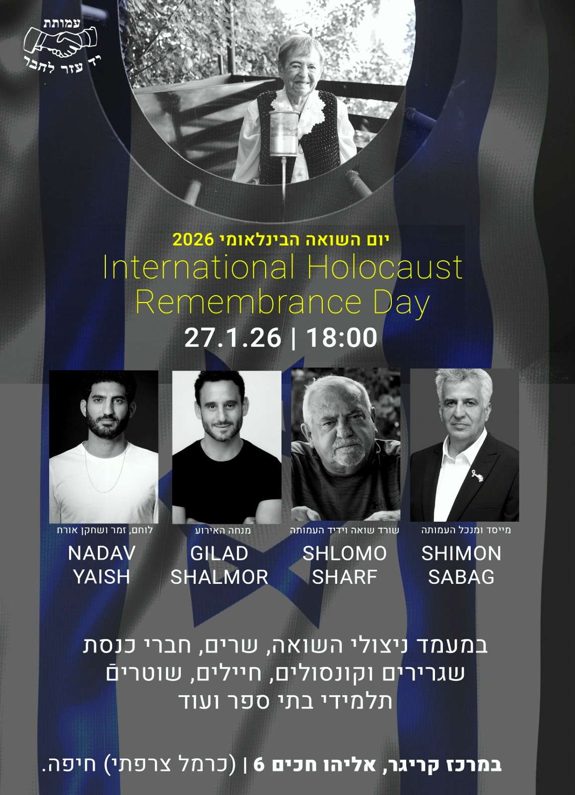 "יום השואה הבינלאומי 2026" יצוין בטקס ובאירוע מרגש ומיוחד בעמותת "יד עזר לחבר" בחיפה • שלישי 27/1/2026 ב"מרכז קריגר" בחיפה בשעה: 18:00 • בטקס יוענק "מגן הצדק החברתי 2026" לגופים ואישים שתרומתם ונדיבות ליבם המבורכת סייעה לטובת רווחתם של ניצולי השואה והאוכלוסיות החלשות