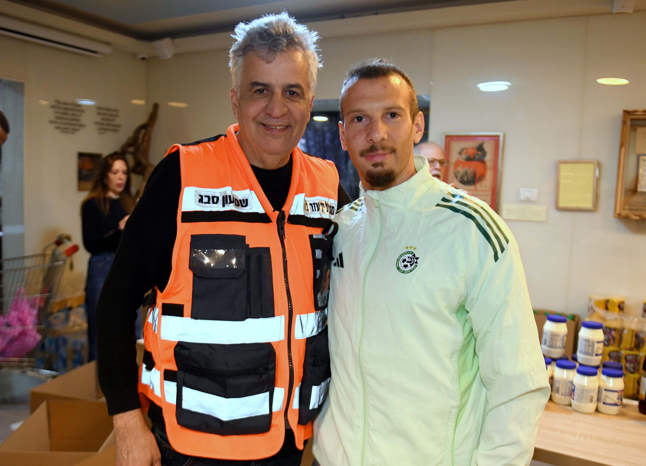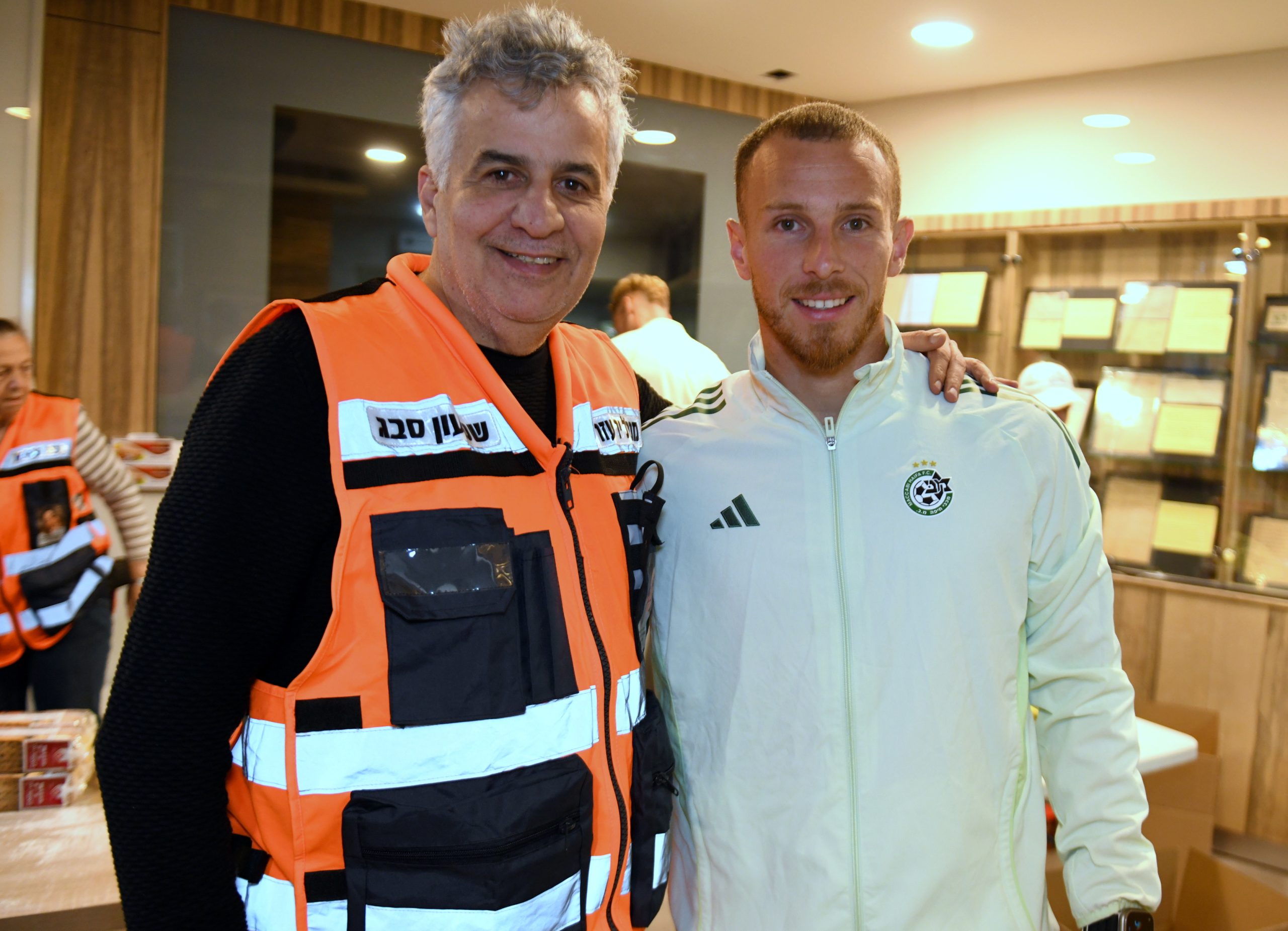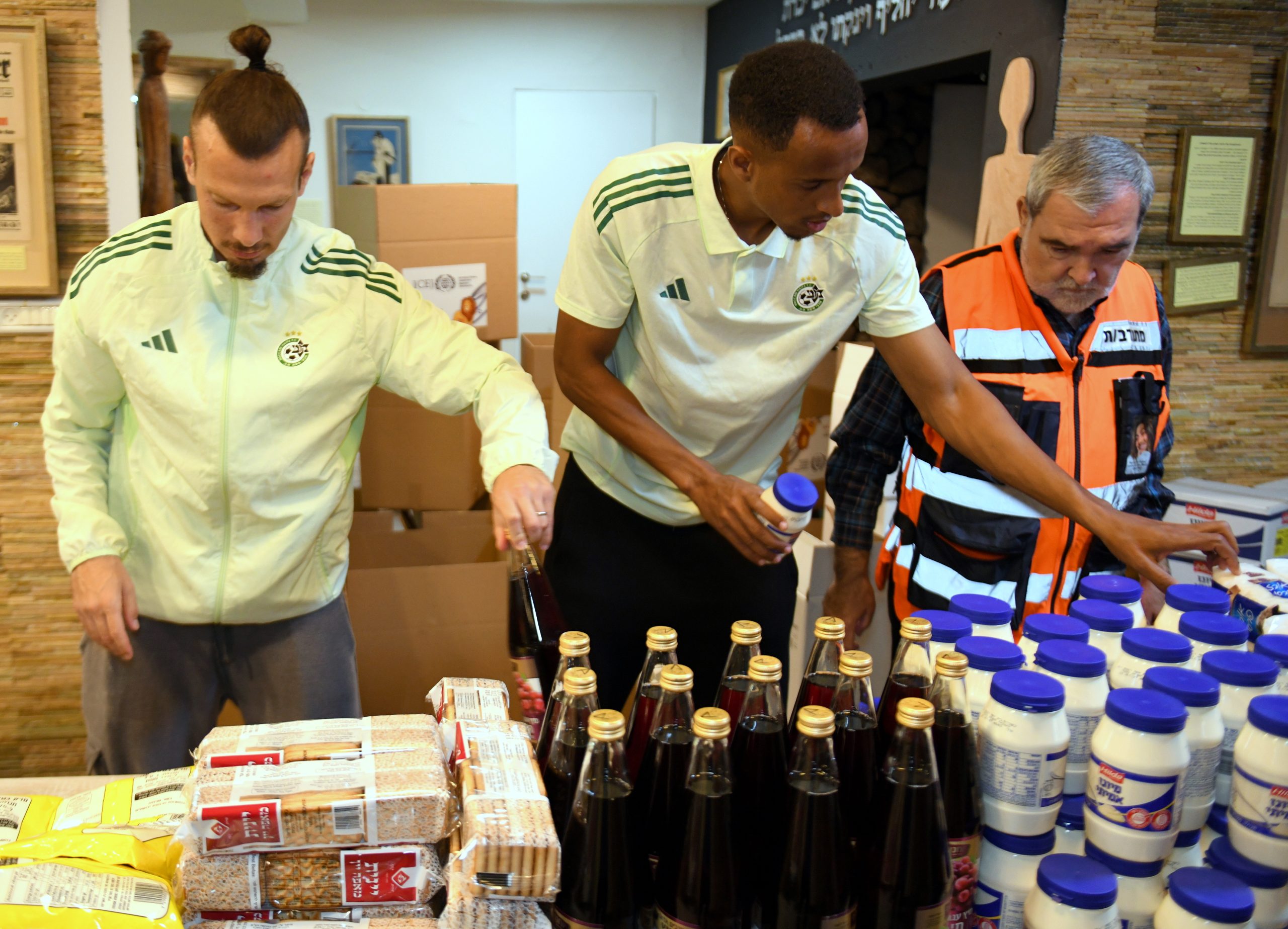 בין שחקני מועדון הכדורגל מכבי חיפה שעמלו וטרחו באריזתם של חבילות המזון היו שון גולדברג, זוהר זסנו, סוף פודגוראנו, ורועי פוקס, שאותם ליוותה דין יודוביץ מנהלת קשרי האוהדים והקהילה המסורה של המועדון. נוכחותם של השחקנים לא הייתה רק פיזית, אלא גם סמלית: תזכורת לכך שאחדות, ערבות הדדית ואנושיות חזקה מכל קושי ומכל איום. בתוך מציאות מאתגרת ומורכבת בה אנו נמצאים כיום, של חוסר ודאות, הם בחרו דווקא להביא אור, תקווה וחום ולהזכיר שדווקא ברגעים הקשים ביותר, הלב הישראלי יודע להתלכד ולעשות טוב.