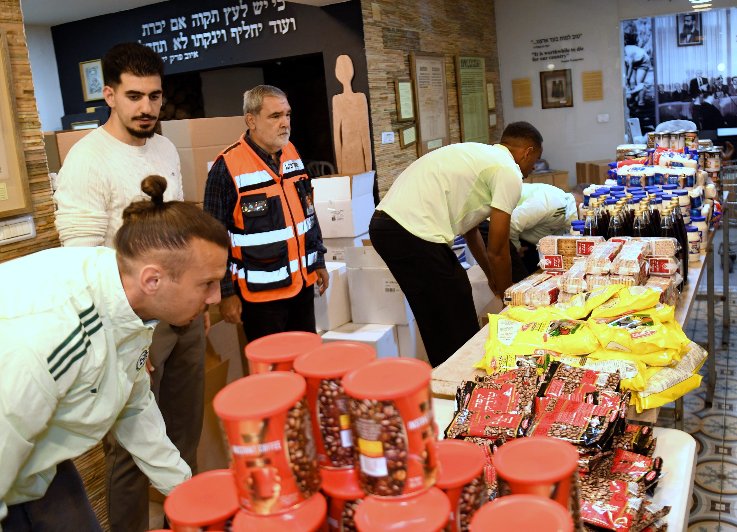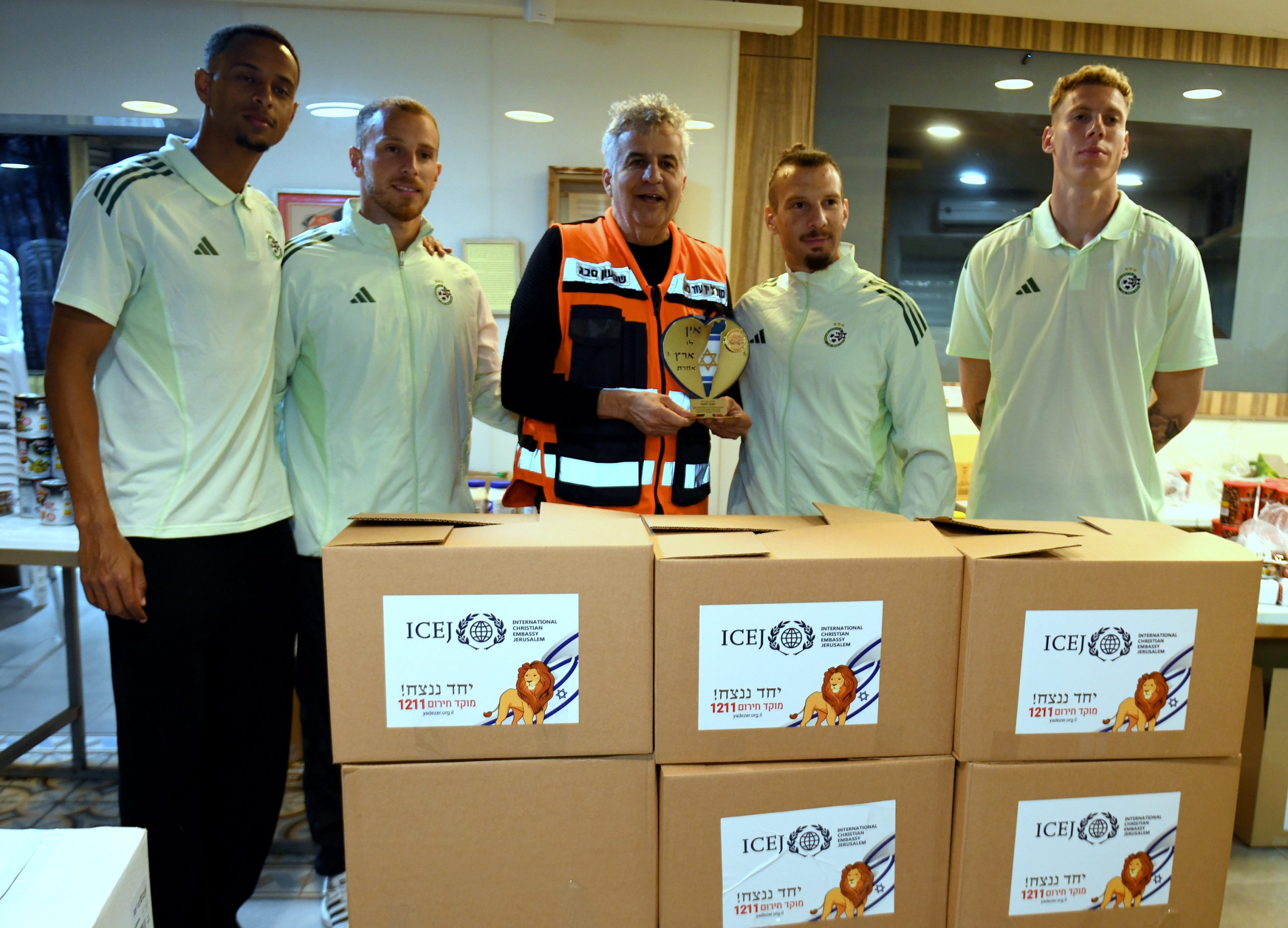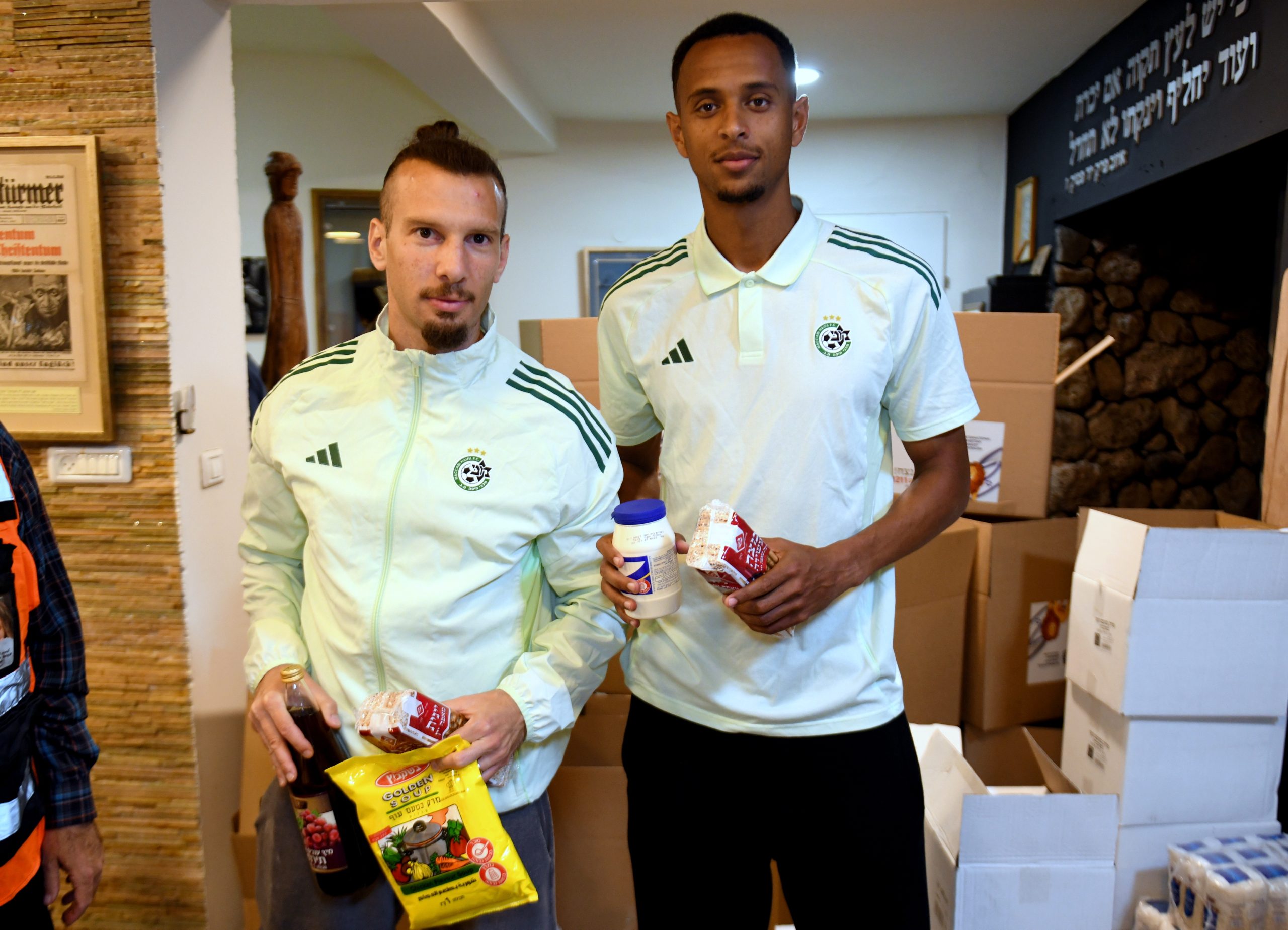 בין שחקני מועדון הכדורגל מכבי חיפה שעמלו וטרחו באריזתם של חבילות המזון היו שון גולדברג, זוהר זסנו, סוף פודגוראנו, ורועי פוקס, שאותם ליוותה דין יודוביץ מנהלת קשרי האוהדים והקהילה המסורה של המועדון. נוכחותם של השחקנים לא הייתה רק פיזית, אלא גם סמלית: תזכורת לכך שאחדות, ערבות הדדית ואנושיות חזקה מכל קושי ומכל איום. בתוך מציאות מאתגרת ומורכבת בה אנו נמצאים כיום, של חוסר ודאות, הם בחרו דווקא להביא אור, תקווה וחום ולהזכיר שדווקא ברגעים הקשים ביותר, הלב הישראלי יודע להתלכד ולעשות טוב.